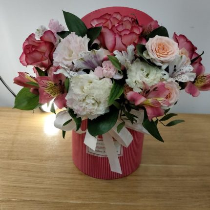 Хризантемы и Пионовидные кустовые розы в коробке + открытка ручной работы в подарок
